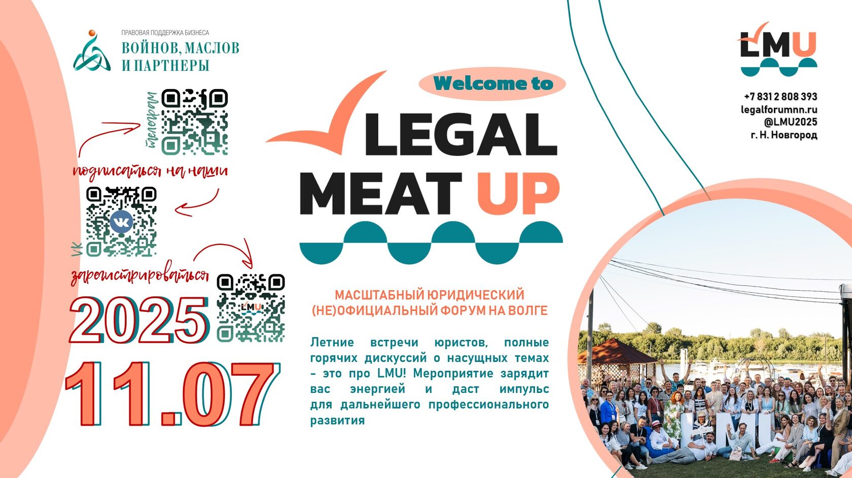 📌11 июля 2025 года Нижний Новгород станет местом притяжения для юристов и специалистов в разных областях права — здесь пройдет Legal Meat Up 2025, неформальная встреча, где обсуждают острые темы, шутят над профессией и просто отдыхают в кругу своих.